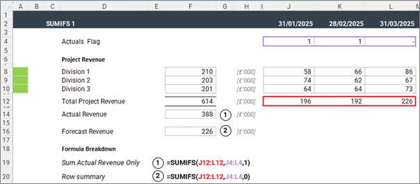 This example summarises actual and forecast revenue. As the Actuals flag changes, the summaries update automatically.