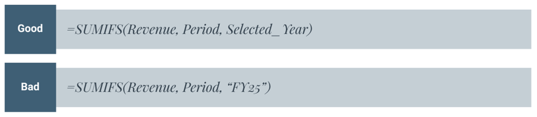 Separation of inputs and calculations is one of our five best practice principles. Reference criteria (e.g., period, scenario, division) from single control cells or lookup tables, not embedded text.